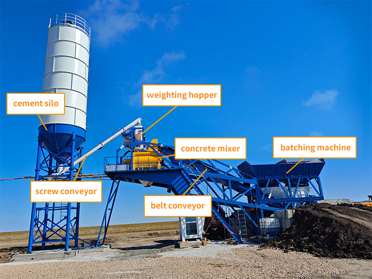 The whole plant has 5 parts, include aggregate batcher, aggregate feeding system, mixer, weighing system and the control system.Main parts of HZS50: